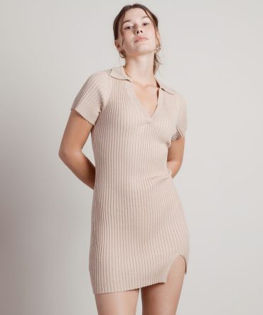 Don’t Let Me Down Plunging Sweater Mini Dress – Toast