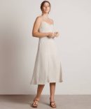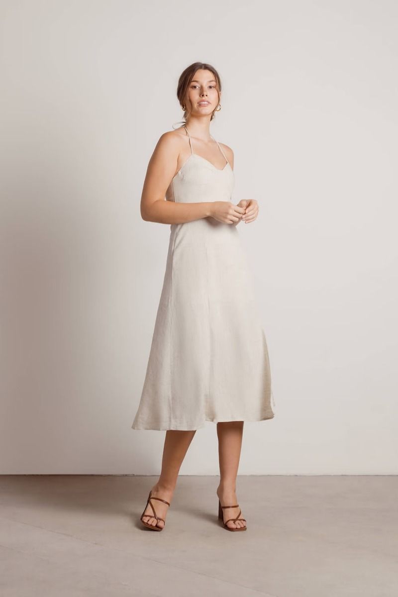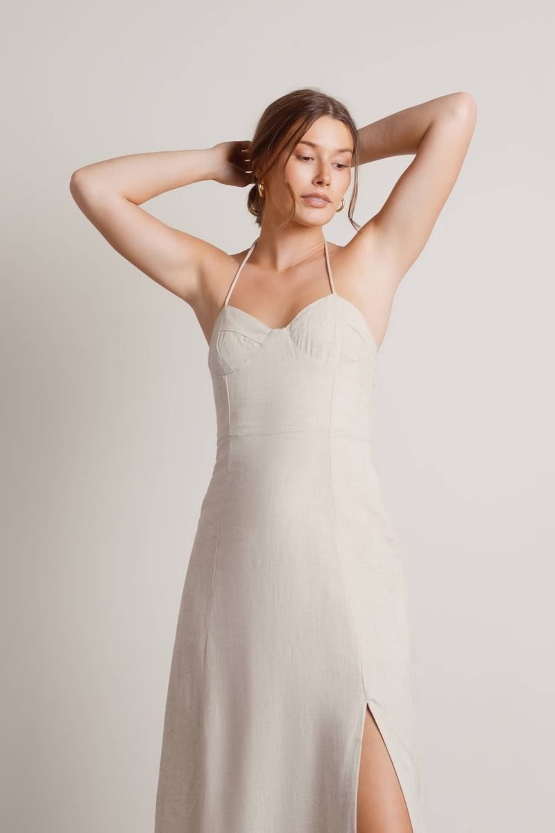 Wear the Maison Oatmeal Bustier Halter Midi Dress in Oatmeal to your next summer outing. This midi dress features adjustable halter neck ties, a side slit, and a hidden side zipper closure. Accessorize this halter dress with gold rings and a clutch to create a seamless brunch outfit, engagement party outfit, vacation outfit.