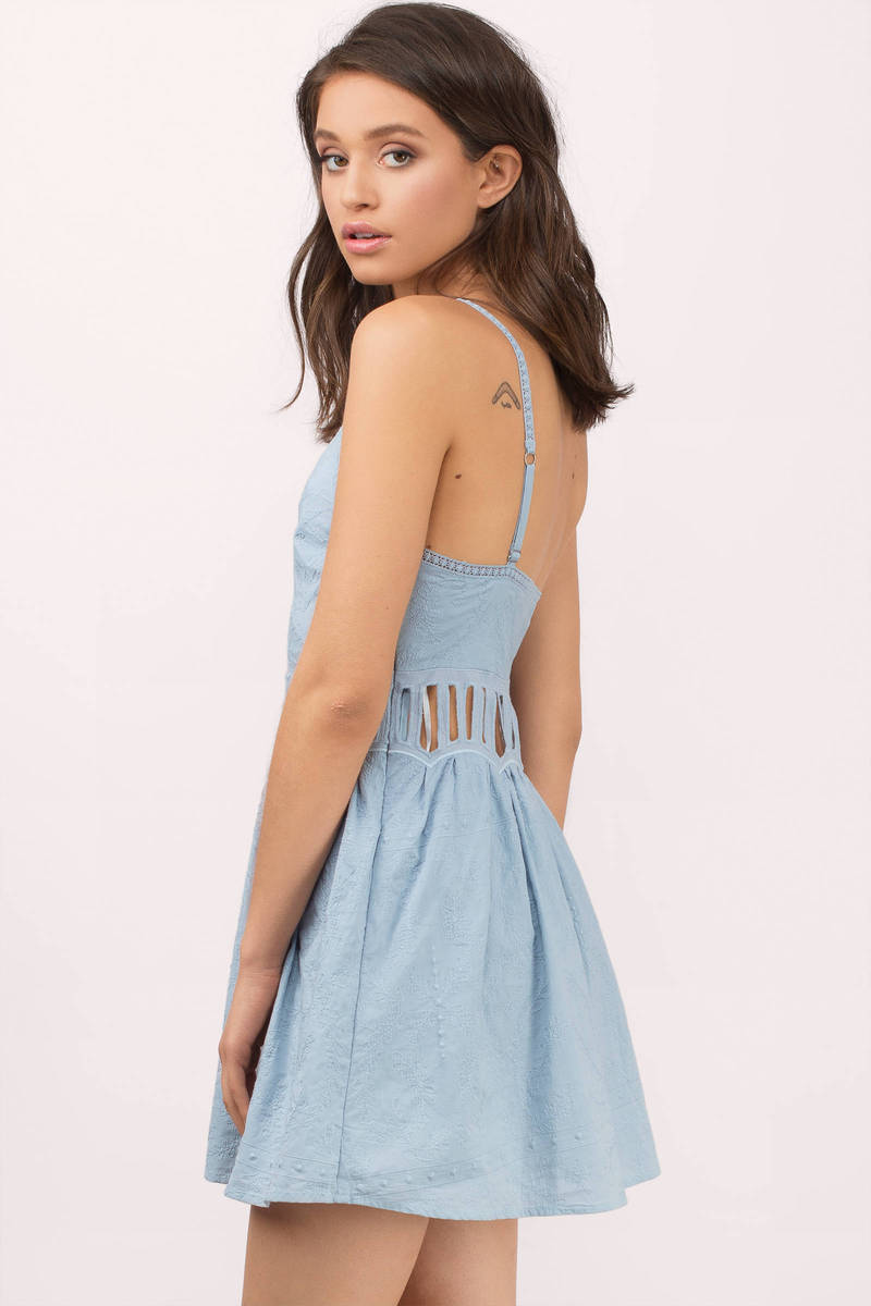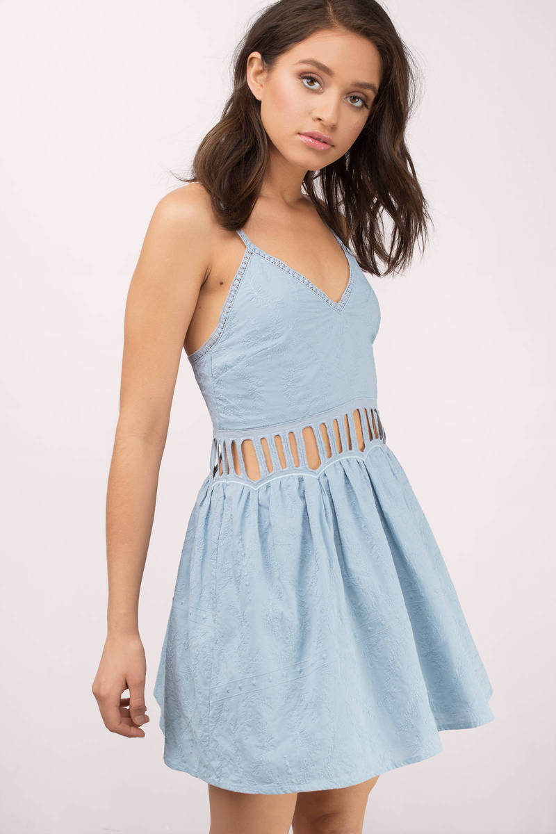 Twirl in the Jetset Diaries Jasmina Embroidered Skater Mini Dress in Powder Blue! This enchanting dress features a V neckline with crochet lace trim, shoulder straps, and a ladder cut-out waist for a flirty touch. Adorned with self-color dots and flowers, it’s the prettiest sundress ever! Crafted from lightweight fabric, it flows beautifully for any occasion. Pair it with strappy sandals for a daytime look or elevate it with heels for a night out. Step into style and make every moment magical!